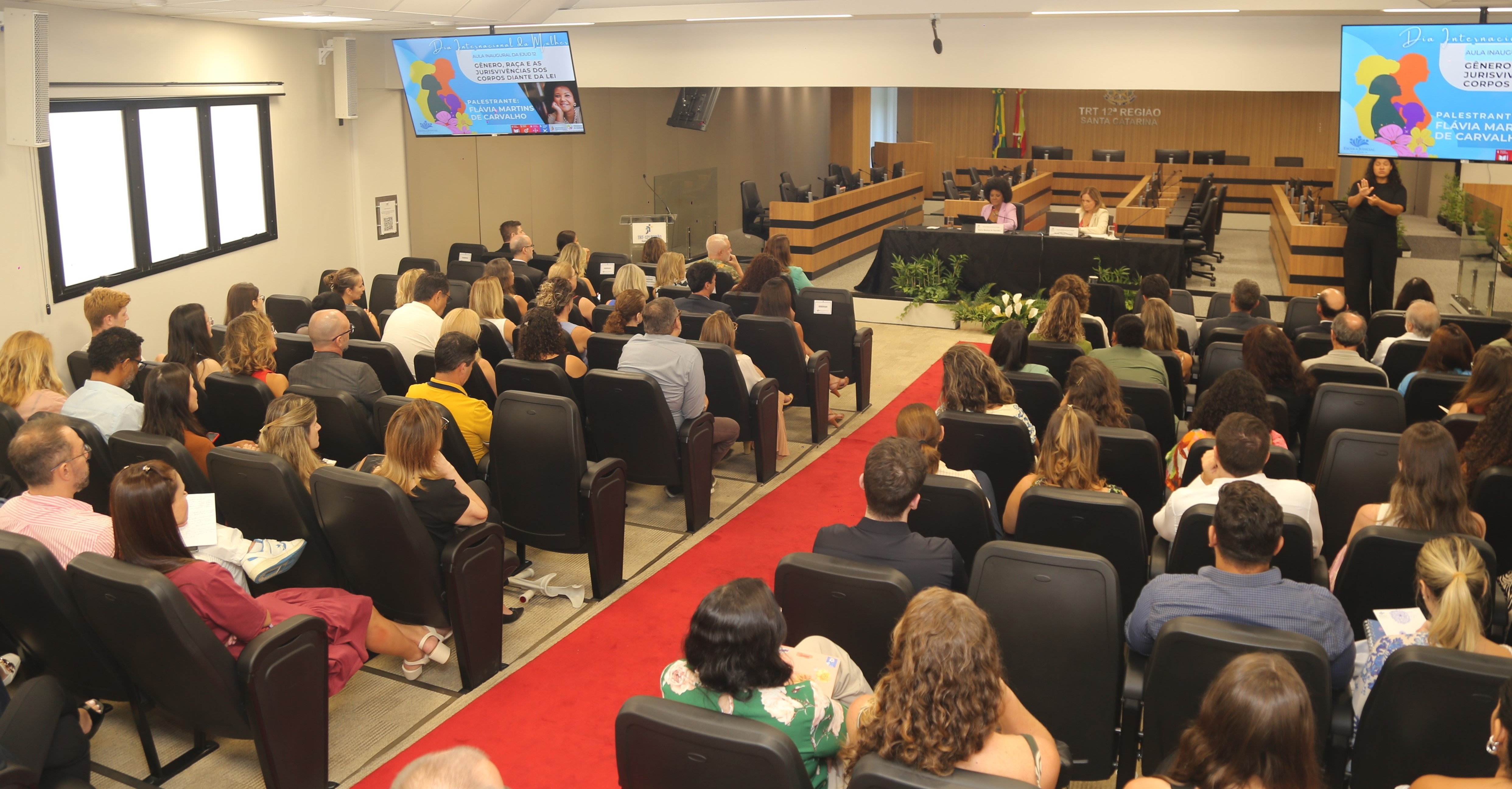 A Escola Judicial do Tribunal Regional do Trabalho da 12ª Região (Ejud-12) realizou, na tarde desta sexta-feira (6/3), em Florianópolis, a aula inaugural do ano letivo de 2026 com a palestra “Gênero, raça e as jurisvivências dos corpos diante da lei”, ministrada pela juíza do Tribunal de Justiça de São Paulo (TJ-SP) Flávia Martins de Carvalho, que também atua como juíza auxiliar do Supremo Tribunal Federal (STF). O encontro ocorreu na Sala de Sessões do Pleno do TRT-SC, com transmissão ao vivo.