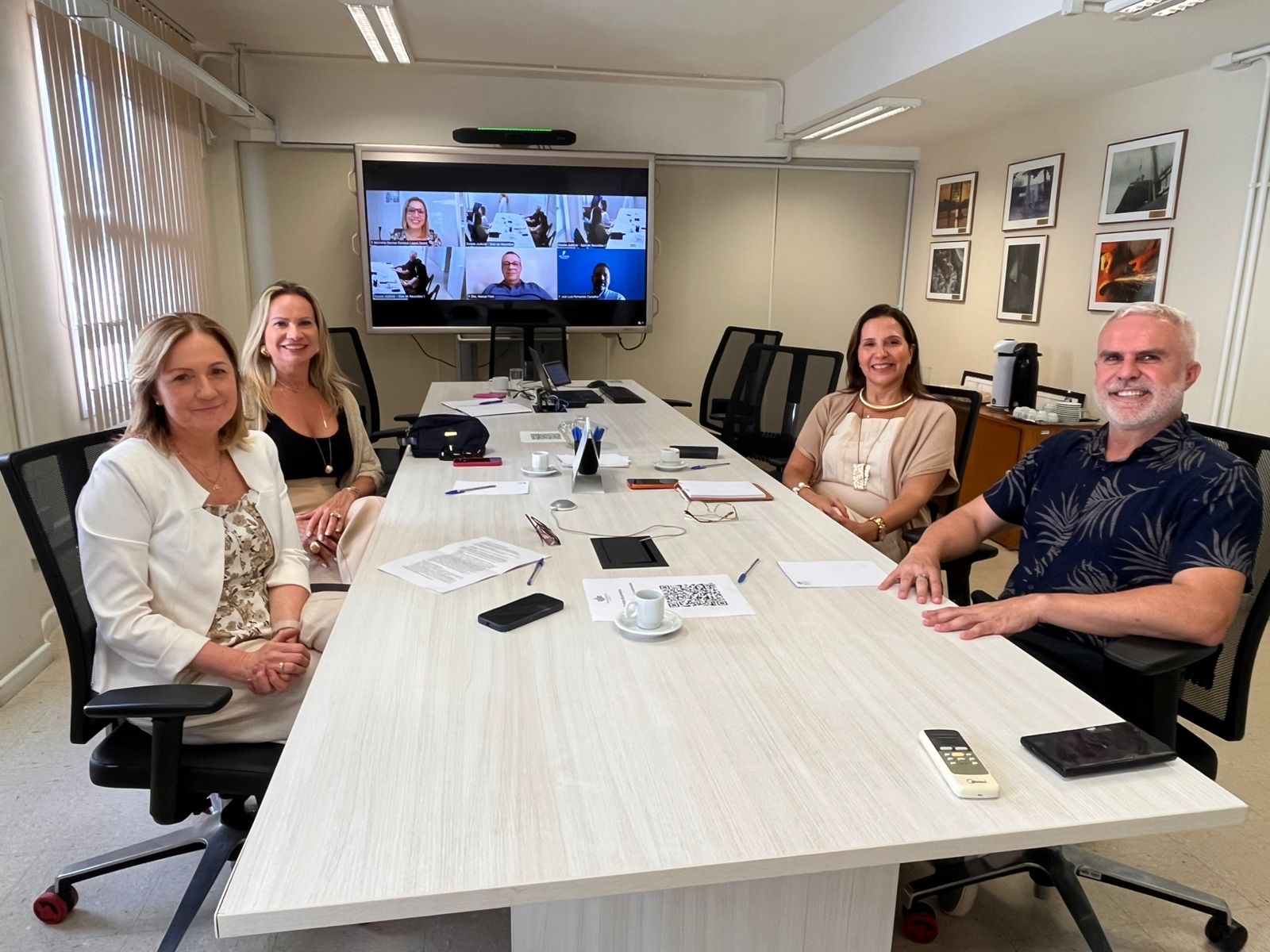Participaram da reunião a diretora da Ejud, desembargadora Mirna Uliano Bertoldi; a vice-diretora, juíza Maria Beatriz Vieira da Silva Gubert; o coordenador pedagógico, juiz Armando Luiz Zilli, e a diretora de secretaria da Escola, servidora Simone Pereira. Pela coordenação técnico-científica participaram de forma telepresencial o desembargador Narbal Antônio de Mendonça Fileti; as juízas Sandra Silva dos Santos e Michelle Denise Durieux Lopes Destri e o juiz Luis Fernando Silva de Carvalho.