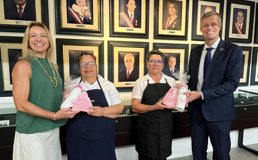 O gestor regional do PTS, desembargador Cesar Luiz Pasold Júnior, e a coordenadora regional do PED, juíza Andrea Maria Limongi Pasold, realizaram a entrega de kits compostos por uma camiseta e uma garrafa squeeze às funcionárias terceirizadas que atuam em todo o estado no TRT-SC. Na última sexta (17/10), os magistrados realizaram a entrega pessoalmente às funcionárias Rejane Antunes e Roseli Maria da Silva, que atuam na sede.