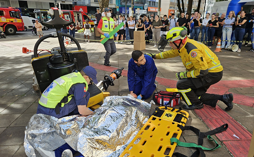Uma ação do Programa Trabalho Seguro (PTS) realizada quarta-feira (15/4), na Praça da Prefeitura de Joaçaba, simulou três acidentes de trabalho simultaneamente, com a participação de equipes de resgate, instituições públicas e privadas e estudantes.